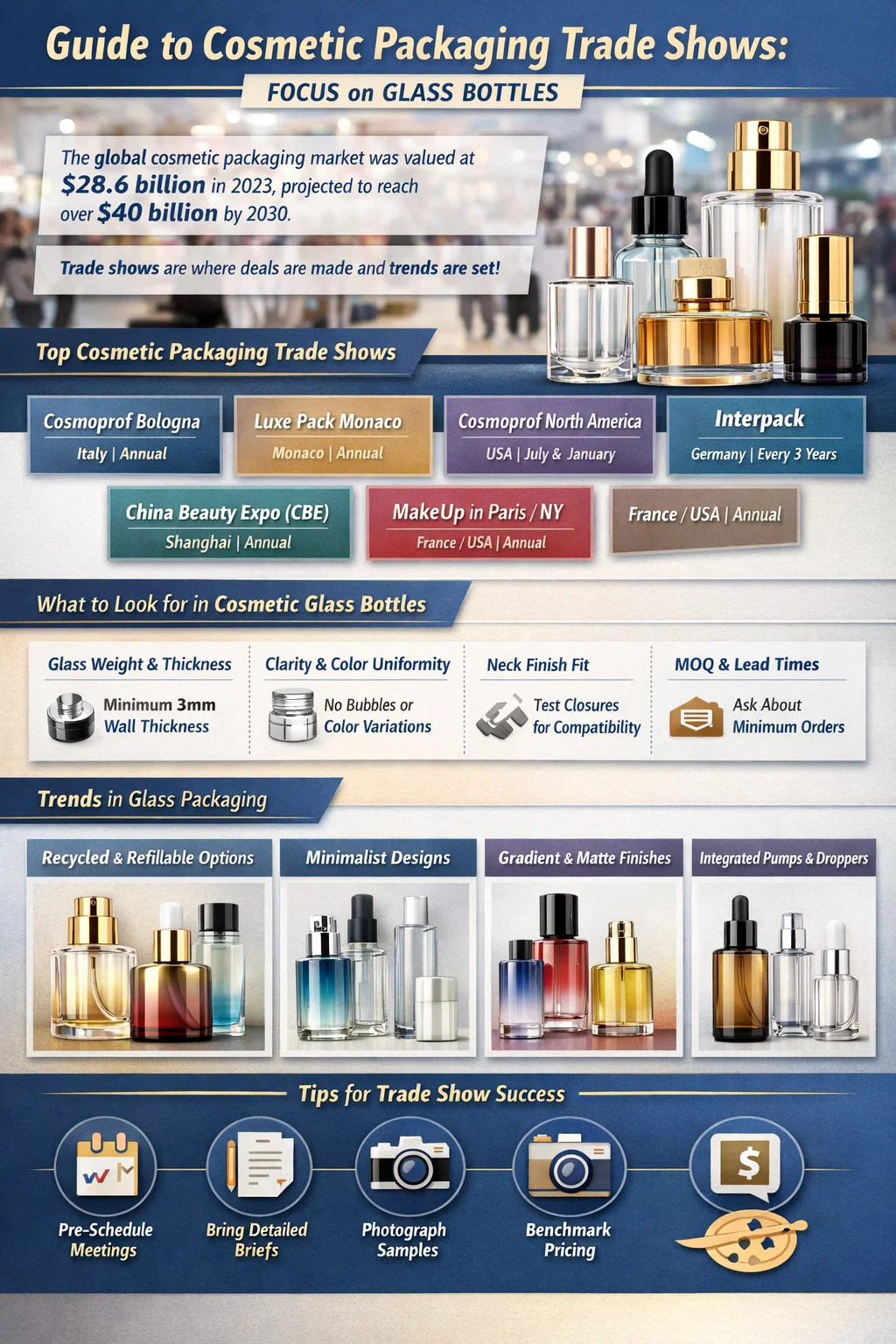 আপনি যদি প্রসাধনী পণ্যগুলির জন্য প্যাকেজিং সোর্সিং করেন - বিশেষত প্রিমিয়াম সামগ্রী যেমন প্রসাধনী কাচের বোতল — সঠিক ট্রেড শো-এ অংশগ্রহণ করা হল সবচেয়ে কার্যকরী সিদ্ধান্তগুলির মধ্যে একটি যা আপনি নিতে পারেন। একটি একক ভেন্যুতে, আপনি শত শত সরবরাহকারীর সাথে তুলনা করতে পারেন, শারীরিক নমুনাগুলি পরিচালনা করতে পারেন, মূল্য নির্ধারণের জন্য সরাসরি আলোচনা করতে পারেন এবং ইমেল আউটরিচের মাধ্যমে প্রতিলিপি করতে কয়েক মাস সময় নেয় এমন সম্পর্ক তৈরি করতে পারেন। বিশ্বব্যাপী প্রসাধনী প্যাকেজিং বাজার প্রায় মূল্যবান ছিল 2023 সালে $28.6 বিলিয়ন এবং গ্র্যান্ড ভিউ রিসার্চ অনুসারে 2030 সালের মধ্যে 40 বিলিয়ন ডলারের বেশি পৌঁছানোর অনুমান করা হয়েছে। ট্রেড শোগুলি হল যেখানে এই বাজারের একটি উল্লেখযোগ্য অংশ আকৃতির হয় — ডিল করা হয়, প্রবণতা সেট করা হয় এবং সরবরাহকারী নেটওয়ার্ক তৈরি করা হয়।
