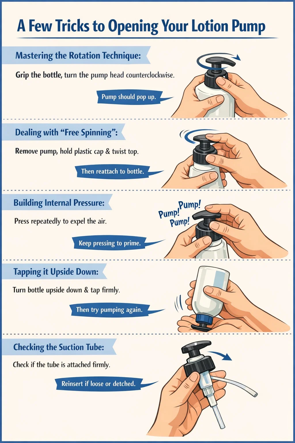 কিছুক্ষণ চেষ্টা করার পরও যদি আপনার লোশন পাম্প কাজ না করে, তাহলে ভিতরের তরল খুব ভারী হতে পারে এবং সাকশন টিউব খোলার জন্য যথেষ্ট কাছাকাছি নাও হতে পারে।