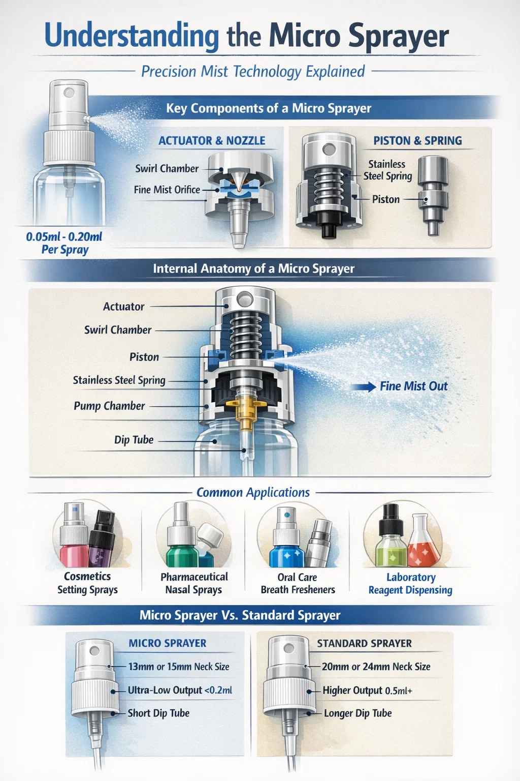 প্রশ্নের উত্তর দিতে "একটি মাইক্রো স্প্রেয়ার কি?" , এটি একটি নির্ভুল-ইঞ্জিনিয়ারড ডিসপেনসিং ডিভাইস যা প্রতি স্ট্রোকে খুব কম আউটপুট ভলিউম সহ তরলকে অত্যন্ত সূক্ষ্ম, সামঞ্জস্যপূর্ণ কুয়াশাতে রূপান্তর করার জন্য ডিজাইন করা হয়েছে। গৃহস্থালী পরিষ্কারের জন্য ব্যবহৃত স্ট্যান্ডার্ড ট্রিগার স্প্রেয়ারের বিপরীতে, ক মাইক্রো স্প্রেয়ার সাধারণত মধ্যে dispenses 0.05 মিলি এবং 0.20 মিলি একটি সময়ে পণ্যের, এটি উচ্চ-মূল্যের তরলগুলির জন্য আদর্শ পছন্দ যেখানে ডোজ নিয়ন্ত্রণ এবং সূক্ষ্ম প্রয়োগ সর্বোত্তম।