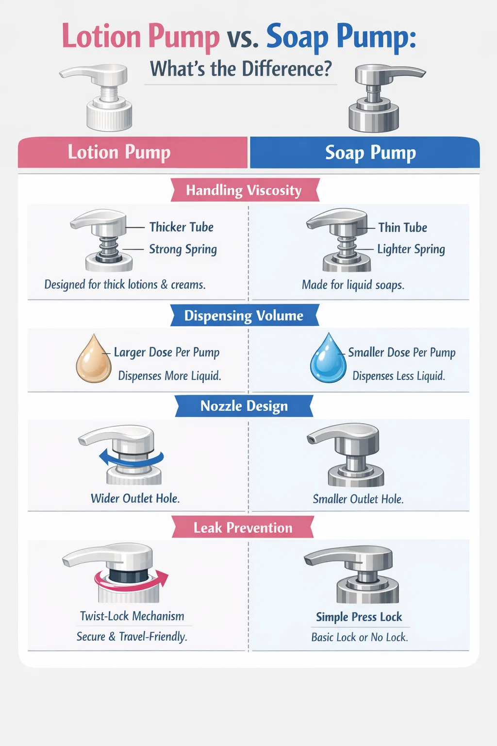 যদিও লোশন পাম্প এবং সাবান পাম্প দেখতে অনেকটা একই রকম এবং প্রায়ই একে অপরের সাথে ব্যবহার করা হয়, তাদের অভ্যন্তরীণ নকশা এবং কার্যকারিতার মধ্যে উল্লেখযোগ্য পার্থক্য রয়েছে।